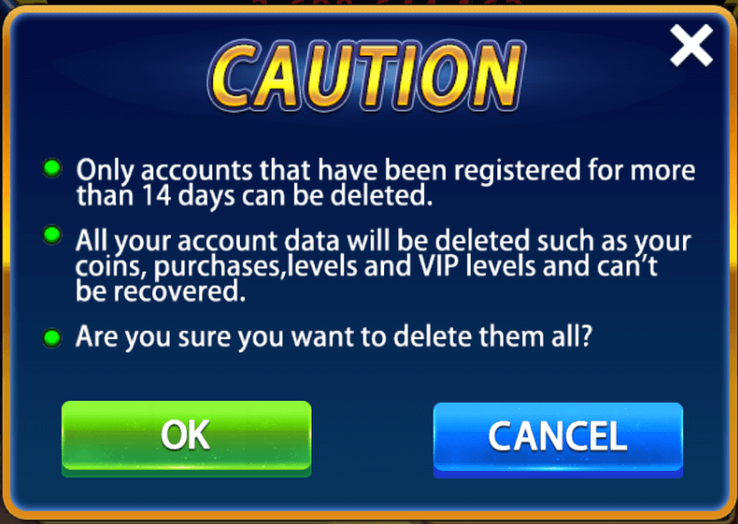 3. Click on "OK". The game will then delete your account and remove all related data.